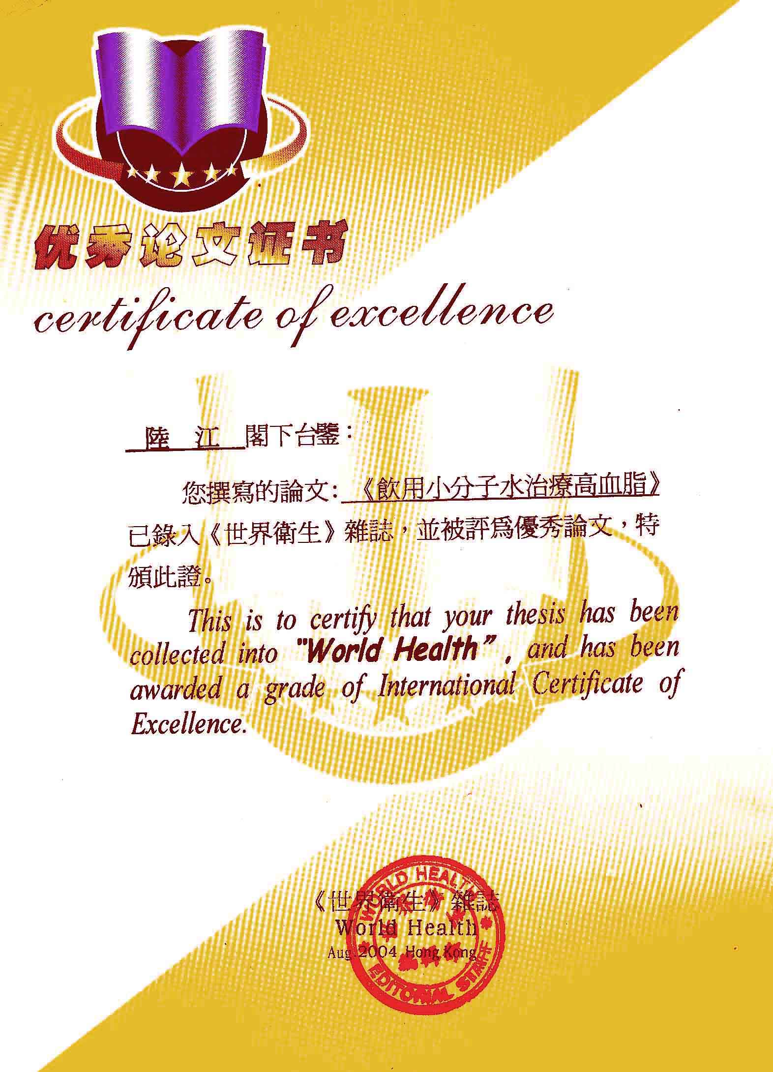 《飲用小分子水治療高血脂》獲優(yōu)秀論文獎