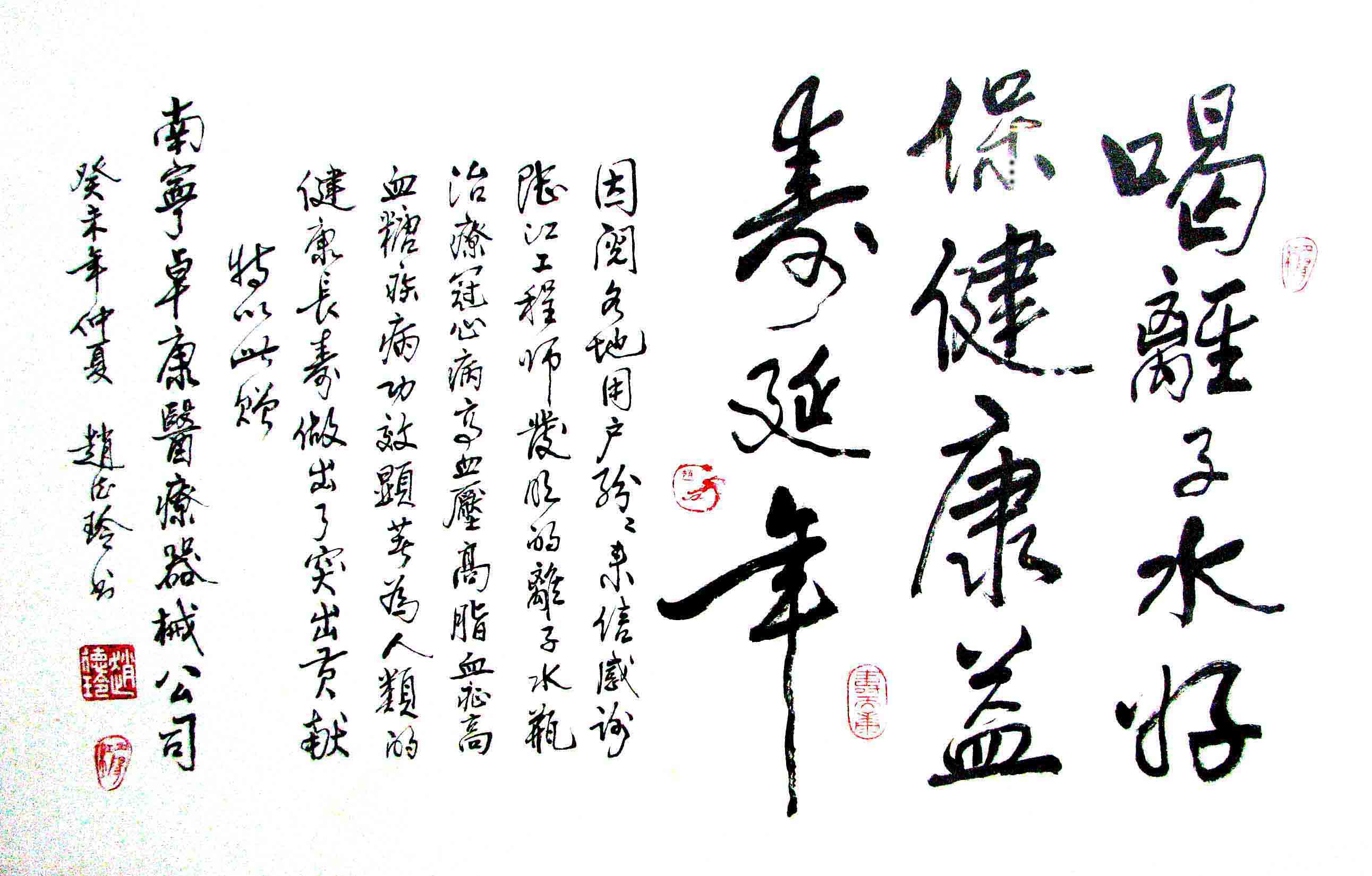 -----我是從事建筑的高工,本來沒有資格去攻克醫(yī)學難題,卻為了自身健康才扣響醫(yī)學的大門。由于我1990年患高血壓,因怕中風才研究發(fā)明了離子水瓶,我把水處理成微小分子團水,飲用后治愈了高血壓。便于1993年底送到三家省級醫(yī)院做臨床試用4個月。經(jīng)北京和廣西醫(yī)學專家鑒定:"降脂降壓效果好"," 能擴大心腦動脈流量,改善心腦電圖以及微循環(huán)","對治療心腦動脈粥樣硬化、高血壓、高血脂有良好的醫(yī)療保健作用。""產(chǎn)品的技術(shù)性能和療效達到了同類產(chǎn)品的國內(nèi)領(lǐng)先水平,經(jīng)廣西醫(yī)學科學情報研究所檢索,未見國外有類似報道。"中國醫(yī)學科學院張正國教授從美國國立醫(yī)學圖書館數(shù)據(jù)庫存Medline檢索英俄文資料,均未見類似報告。2000年上市后,我為了對消費者負責而繼續(xù)觀察研究,一直通過《信譽卡》和《質(zhì)量跟蹤調(diào)查書》向患者承諾療效,請用戶使用6個月后反饋效果。和脂壓患者飲用2至5個月內(nèi),消除癥狀,停服藥物,血壓正常;冠心病患者飲用3~5個月逐漸減輕至消除心絞痛、房顫等癥狀,不再服藥,飲用1年左右心電圖正常,經(jīng)冠脈造影掃描無明顯狹窄,表明冠心病痊愈。大量患者還反映許多衰弱器官被修復,讓前列腺增生、慢性咽喉炎、慢性氣管炎、支氣管炎、慢性胃炎、腸炎和膽囊炎等不藥而愈;2型糖尿病患者是因為胰島衰弱致病,飲用該水半年至一年,逐漸減藥至停藥,血糖尿糖正常,真正治愈2型糖尿病。中風后遺癥患者飲用六七個月,可逐漸減輕至消除肢體和語言障礙,表明飲用該水能讓壽命很長的神經(jīng)元細胞逐漸修復,奇跡般地恢復肢體和語言功能。飲用后還使胸腺和脾臟兩個重要的免疫器官被修復和增強,產(chǎn)生免疫細胞多,提高了免疫力,使人不生病或少生病。自此, 飲用微小分子團水創(chuàng)造了攻克冠心病、高(低)血壓和糖尿病三大醫(yī)學難題的奇跡。人們對此感到不可思議,但實踐是檢驗真理的唯一標準。