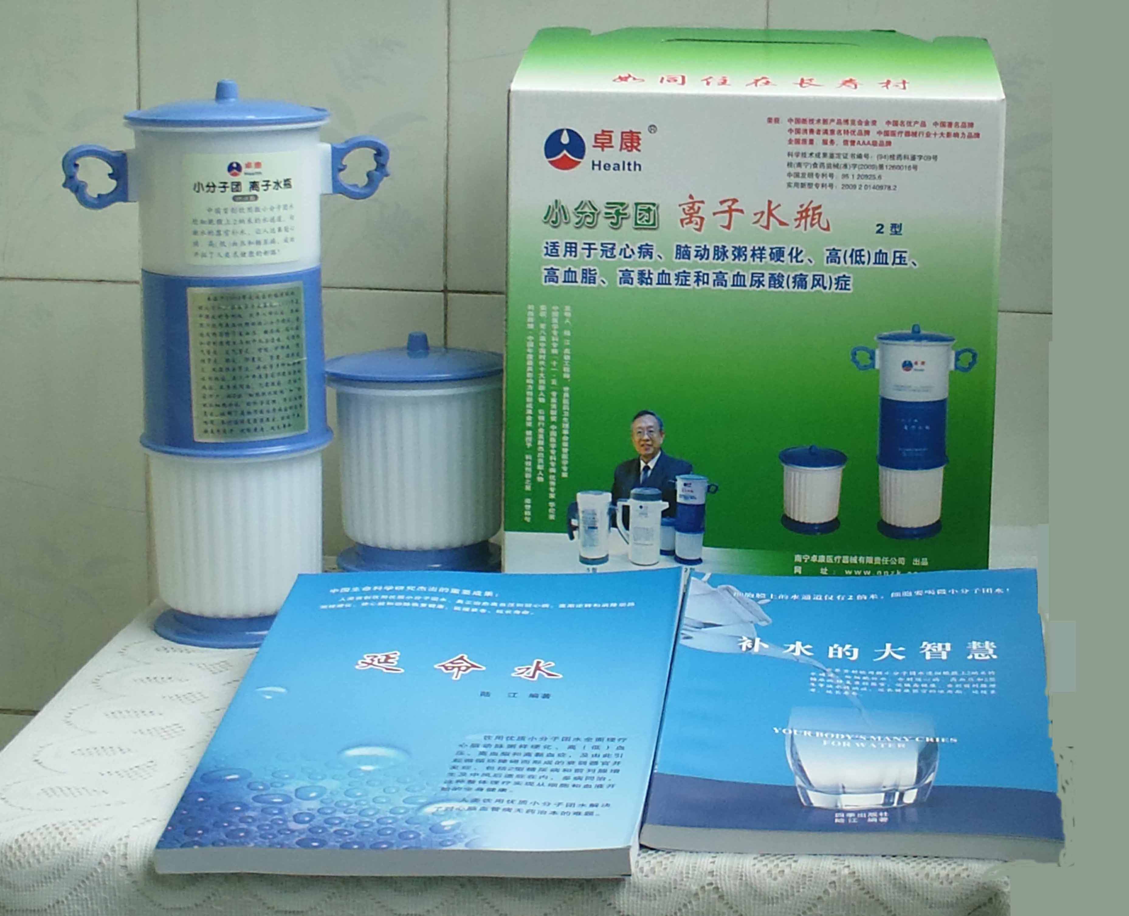 本品大量用戶的使用效果表明,能治愈冠心病、腦動脈硬化、原發(fā)性高(低)血壓、高血脂、高粘血癥、高血尿酸癥(痛風)和2型糖尿病、衰弱器官并發(fā)癥(前列腺增生、腎衰與尿毒癥)及中風后遺癥等療效好。產(chǎn)品配信譽卡。使用壽命30年,不換芯,易清洗。團購優(yōu)惠。從郵局匯款,匯費1%,地址按本頁下方地址、聯(lián)系人寫。從銀行匯款,請點擊[聯(lián)系匯款]欄,從工商銀行匯款,建設(shè)銀行、農(nóng)業(yè)銀行匯款,均免收匯費,匯款后20--30分鐘內(nèi)發(fā)短信,可用微信轉(zhuǎn)帳,均免匯費,微信號即手機號13768308380。匯款后,告知你的姓名和地址,我公司聯(lián)系人手機號是:13768308380卓康牌離子水瓶為我公司獨家生產(chǎn),郵購產(chǎn)品配《補水的大智慧》彩印書一本,另配四季出版社出版的新書《補水的大智慧》一本,并配光盤一張(含央視主持人釆訪陸江的對話視頻)。目前市場和"淘寶網(wǎng)"上有人兜售假冒的偽品,望讀者審察辯別真?zhèn)危旒僬哓飧`假冒本公司的各種證、獲獎獎項、專利號和外包裝盒上的中英文字,包括科技成果的鑒定意見等,請讀者注意防偽。如何識別假貨?已經(jīng)買了假貨怎么辦?(請點擊[打假掠影][打假掠影])。